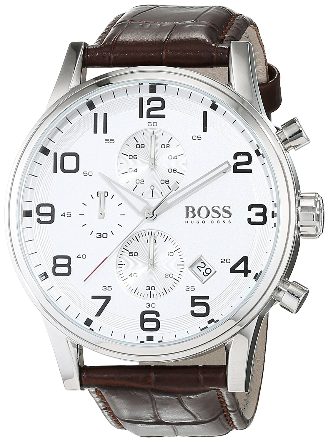 Montre chronographe Hugo Boss Aeroliner pour homme avec cadran argenté 1512447 chronographe, fonction date, index numériques et gros bouton latéral. La montre se ferme avec un bracelet en cuir marron.